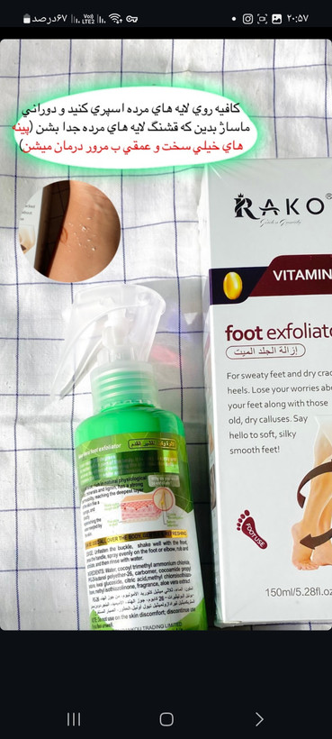 اسپری لایه بردار بدن میاد سلولهای مرده پوست بدن و کف پا رو در میاره و نمیزاره تیرگی بمونه و ضخیم تر بشه هر چی تیرگی باشه پوست خشک همه رو برات در میاااره بدون اسیب وخشکی مناسب استفاده بدن زیر بغل بیکینی قوزک پا خشکی و پینه کف پا و تیرگی زانوها همه رو برات در میاره و موستتو عین پوست بچه نرم ولطیف میکنه وپوست چند درجه روشن میشه